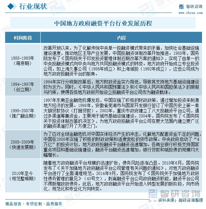 中国地方政府融资平台行业发展主要经历了五个阶段。1988年至1993年的萌芽期,改革开放以来,为了化解传统中央单一投融资模式带来的矛盾,加快社会基础设施建设速度,推动地区主导产业发展,中国投融资体制改革开始推进。1988年,国务院发布了《国务院关于印发投资管理体制近期改革方案的通知》,实现了由单一的中央投融资模式向中央与地方共同投融资模式的转变。地方政府开始成立专业投资公司,如上海久事公司(1986年成立)和上海城投(1992年成立),这些公司成为地方政府投融资平台的前身。