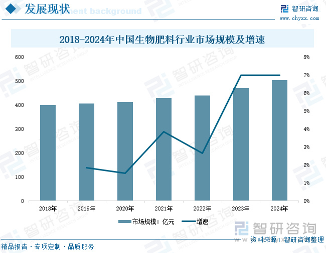 内容概要:在现代农业中,化肥始终占据着举足轻重的地位,被广泛用作农资。然而,随着化肥的长期大量使用,土壤问题逐渐浮现,如有机质和腐殖质的匮乏,进而引发土壤污染、板结和酸化等严重问题。这些负面影响促使人们寻求更环保的农业解决方案。在此背景下,绿色农业的发展理念和耕地资源的保护需求共同推动了新型肥料的研究与推广。其中,生物肥料以其独特的优势脱颖而出,被农业农村部誉为未来最具潜力的肥料,甚至被视为种地的必备之选。近年来,我国生物肥料行业迎来了迅猛发展的黄金时期。受绿色有机食品消费增长、精准农业发展、化肥农药零增长政策等因素的驱动,中国生物肥料行业市场规模从2018年的399.6亿元增长至2023年的471.44亿元,估计2024年行业市场规模达到504.44亿元左右,同比上涨7%。