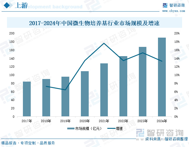微生物培养基是微生物培养的基础,它为微生物的快速成长提供营养物质。随着现代生物科技的发展,利用细胞工程、基因工程、发酵工程以及酶工程等新型生物技术来获得大量常见化工过程难以获得的化工新产品已经付诸现实,新发现、新技术、新成果层出不穷,不断改善着人们的生产生活方式和水平,并推进人类社会科技向前发展,是推动二十一世纪科技革命的关键力量,近年来中国微生物培养基市场飞速发展。据统计,2017年中国微生物培养基行业市场规模达到84.1亿元,到了2023年中国微生物培养基市场规模达到167.6亿元。估计2024年行业市场规模增长至189.9亿元,同比上涨13.31%。