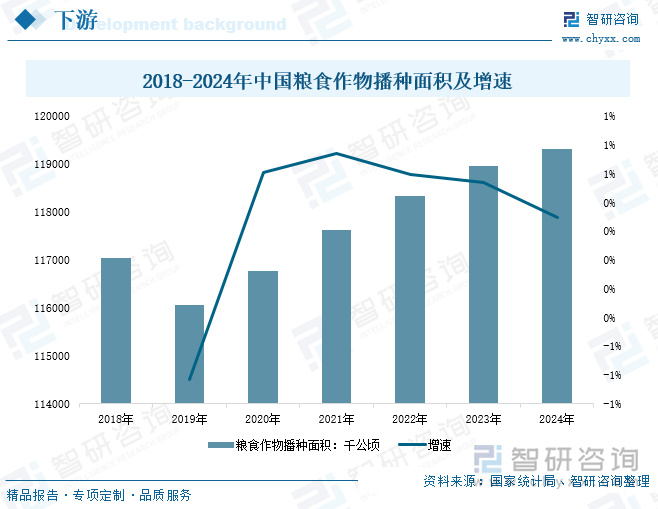 种植业是生物肥料的主要应用领域之一。生物肥料应用效果好,施用后不仅增产,而且能改善农产品品质和减少化肥用量,在中国可持续发展农业中占有重要的地位。近年来,为增强我国粮食自给能力,中国粮食作物播种面积呈现上升趋势,从2018年的117038.21千公顷增长至2024年119319.10千公顷。随着我国粮食作物播种面积的增加,对生物肥料的需求也随之不断上升。