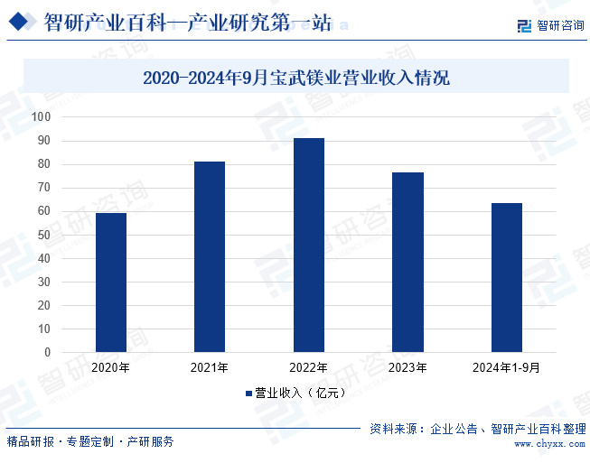 宝武镁业科技股份有限公司(简称“宝武镁业”)是一家主营业务为镁、铝轻质合金材料及其挤压、压铸等深加工业务的企业。宝武镁业聚焦于镁合金材料的研发、生产和销售,致力于打造集研发、生产、应用于一体的镁基新材料产业生态链。公司在镁合金行业拥有深厚的技术积累,产品覆盖多种规格的镁合金板材、型材和铸件,广泛应用于汽车、轨道交通、航空航天、电子信息等行业。宝武镁业积极与下游应用端合作,推进镁合金在轻量化领域的广泛应用,并注重镁合金的循环利用与绿色生产,符合未来低碳经济的发展趋势。2023年,宝武镁业营业收入有所下降,营业收入为76.52亿元,同比下降15.96%。2024年1-9月,宝武镁业营业收入为63.47亿元,同比上年同期增长14.09%。