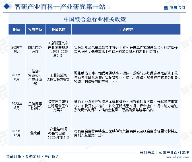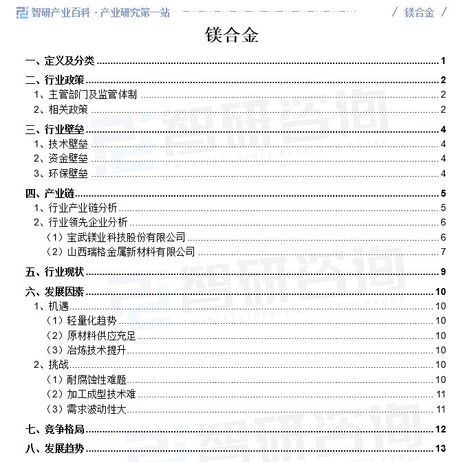 智研产业百科是智研咨询推出的产研工具平台,致力于为您提供全方位的百科式产业信息查询服务。智研咨询践行用信息驱动产业发展的企业使命,完善和丰富企业方法论,依托产业百科平台提升信息价值,持续为行业发展及企业投资决策赋能。镁合金产业百科作为镁合金产业一站式系统化研究工具,全面归纳了镁合金产业知识信息,内容涵盖镁合金产业的定义、分类、政策、产业链、竞争格局、发展趋势等,并依靠信息技术建立智能互链的行业知识图谱,为行研从业者及相关投资者提供深入的洞察力和全面的信息。