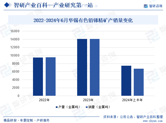 广西华锡有色金属股份有限公司承接原华锡集团的核心资产及业务,前身为大厂矿务局,成立于1952年,是广西唯一国有有色金属行业上市公司,股票简称“华锡有色”。华锡有色主营业务为有色金属勘探、开采、选矿业务,主要产品为锡、锌、铅锑精矿,并通过委外加工模式生产锡、锌锭,同时涉足工程监理业务。2024年上半年,华锡有色铅锑精矿产量为7484.89金属吨,同比上升11.15%;铅锑精矿销量为6734.3金属吨,同比增长11.02%。