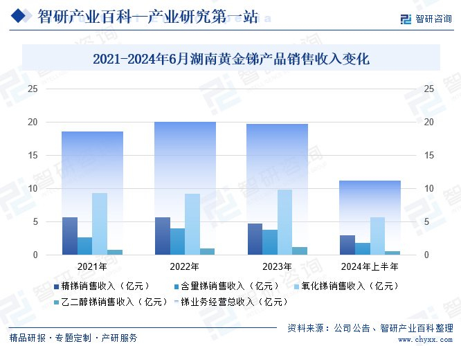 湖南黄金股份有限公司前身是湖南省湘西金矿,2000年12月25日,经湖南省人民政府批准,湘西金矿改制成立湖南辰州矿业有限责任公司,2006年6月1日整体变更为湖南辰州矿业股份有限公司,2007年8月16日在深圳证券交易所上市,股票简称“湖南黄金”。湖南黄金主要从事黄金及锑、钨等有色金属矿山的开采、选矿,金锑钨等有色金属的冶炼及加工,黄金、精锑的深加工及有色金属矿产品的进出口业务等,拥有集矿山勘探、开采、选矿、冶炼、精炼、深加工及销售于一体的完整产业链,公司主营产品为标准金锭、精锑、氧化锑、乙二醇锑、塑料阻燃母粒和仲钨酸铵等。2024年上半年,湖南黄金锑产品销售总收入为11.28亿元,同比增长29.15%;其中,精锑、含量锑、氧化锑、乙二醇锑的销售收入分别为3.03亿元、1.87亿元、5.76亿元、0.62亿元。