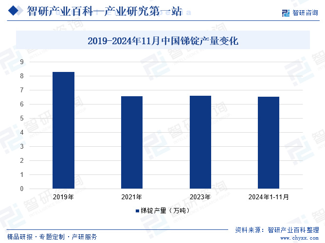 我国是锑矿产业第一大国,但无序开采以及低回收率一直是锑行业发展所面临的重要问题,随着锑资源战略地位的不断提升,出于对锑矿资源的保护,我国开始限制锑矿的开采。因而,在国内锑矿产量逐渐减少的情况下,我国锑行业生产产品,锑原料(锑精矿及其他)及锑锭的产量均呈现下滑态势。据统计,2023年,我国锑原料产量已从2019年的5.23万吨下降至4.1万吨,下降幅度超过20%;锑锭产量已从2019年的8.31万吨下降至6.62万吨,下降幅度为20.34%,同样超过20%。2024年1-11月,国内锑锭累计产量为6.56万吨。