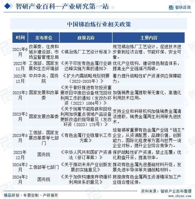 近年来,我国锑冶炼行业受到各级政府的高度重视和国家产业政策的重点支持。国家陆续出台了多项政策,鼓励锑冶炼行业发展与创新,《国务院办公厅关于加快构建废弃物循环利用体系的意见》《七部门联合印发关于推动未来产业创新发展的实施意见》《中华人民共和国矿产资源法(修订草案)》等产业政策为锑行业的发展提供了明确、广阔的市场前景,为企业提供了良好的生产经营环境。