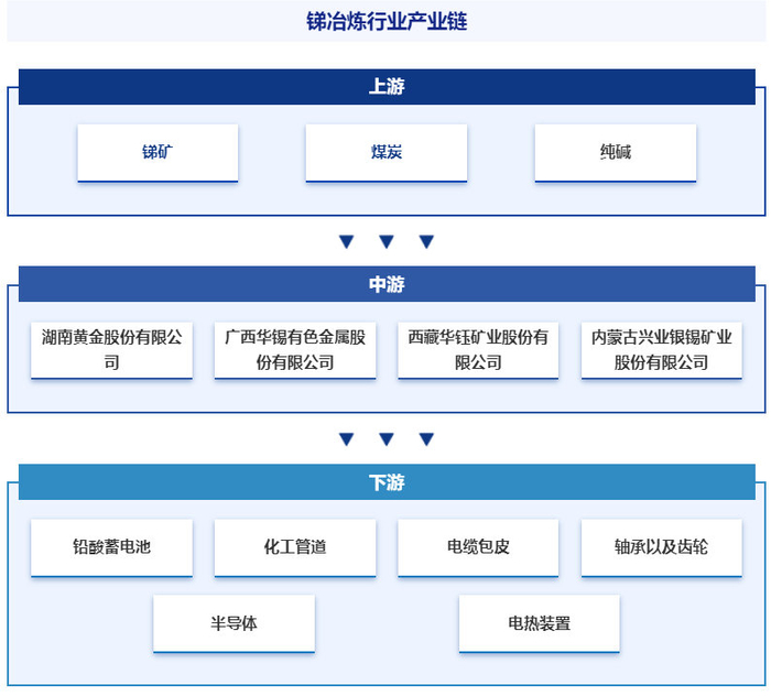 锑冶炼行业产业链上游为锑矿产开采及原材料供应环节,包括锑精矿勘探开采、煤炭、纯碱。产业链中游为锑冶炼加工环节,即锑矿经过冶炼加工得到氧化锑、乙二醇锑、锑合金等产品,氧化锑又可继续加工为焦锑酸钠等产品。产业链下游锑冶炼产品应用领域,包括铅酸蓄电池、化工管道、电缆包皮、轴承以及齿轮、半导体、电热装置、远红外装置、军工产品、阻燃剂、陶瓷颜料、玻璃澄清剂、橡胶、纺织及化工产品等生产制造业。