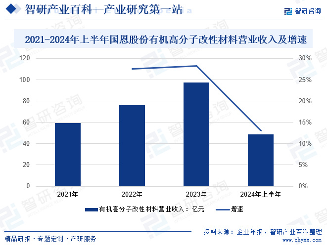 青岛国恩科技股份有限公司成立于2000年,是一家高新技术企业。公司持续优化产业结构,已初步发展成为拥有绿色石化、有机高分子改性、有机高分子复合、可降解、光显、运动健康材料,以及新能源汽车轻量化结构部品等化工新材料纵向一体化产业集群。在有机高分子改性方面,公司高分子改性材料已实现从单一改性塑料到多品种化工新材料的升级,产品结构不断向产业高端和高附加值的方向延伸,主要覆盖家电及汽车改性材料、新能源行业材料、可降解材料、光显材料、运动健康材料等。其中在新能源领域,公司深化以比亚迪、宁德时代、吉利汽车为代表的重点客户合作,持续提升改性 PP、PC、ABS、PA、PMMA 等相关汽车内外饰材料的市场占有率。2024年上半年,公司有机高分子改性材料营业收入达到48.84亿元,同比上涨13.05%。