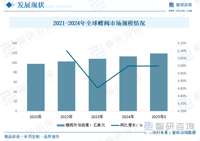 近年来,石油和天然气行业对蝶阀强劲的需求,以及各行业自动化趋势凸显,蝶阀整体市场呈现增长趋势。2024年全球蝶阀市场规模约为113.4亿美元,预计2025年约为119.07亿美元。