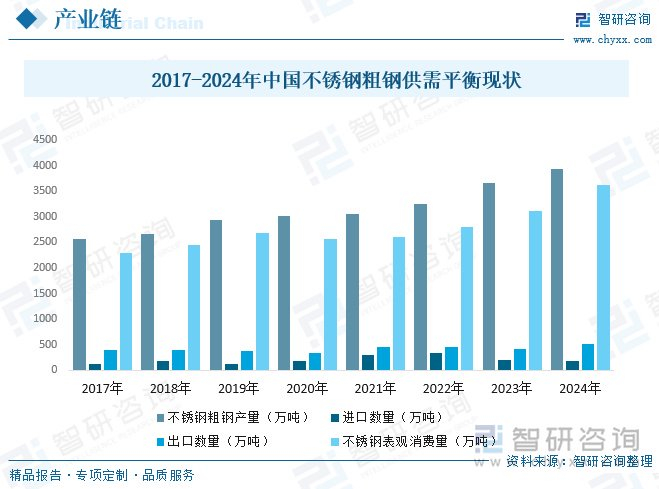 不锈钢是一种具有优异耐腐蚀性和强度的金属材料,其优良的抗腐蚀性能使其在各种恶劣环境下都能保持稳定的工作状态。因此不锈钢材质在蝶阀的应用已经越来越广泛。近年来,中国不锈钢产业整体竞争力在不断趋强。2024年,我国不锈钢粗钢产量3944.11万吨,较2023年增长276.52万吨;进口量187.8万吨,较2023年减少19.32万吨;出口量504.4吨,较2023年增加90.69万吨;不锈钢表观消费量3627.46万吨,较2023年增长519.24万吨。