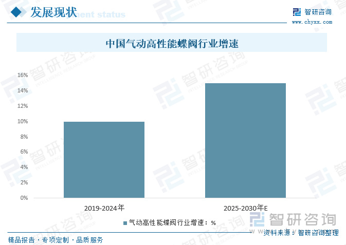 近年来,随着我国城市化建设进程加快,对配水系统、污水处理厂和建筑物内的HVAC系统中的蝶阀产生了巨大需求。2019-2024年,我国气动高性能蝶阀行业增速约10%,预计2025-2030年我国气动高性能蝶阀行业增速约15%。