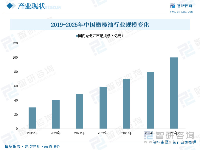 内容概要:橄榄油属木本植物油,是由新鲜的油橄榄果实直接冷榨而成的,不经加热和化学处理,保留了天然营养成分,橄榄油被认为是迄今所发现的油脂中最适合人体营养的油脂。随着居民收入水平的提高和消费观念的转变,越来越多的消费者开始追求高品质、健康的生活方式,橄榄油作为高品质食用油的代表之一,其营养价值得到了广泛认可,受到了越来越多消费者的青睐,叠加国家政策对橄榄油产业链支持力度日益增强,我国橄榄油行业呈现出加速发展态势。据统计,2024年我国橄榄油市场规模已从2019年的30亿元增长至80亿元;根据市场预测,2025年产业规模有望达到100亿元以上。