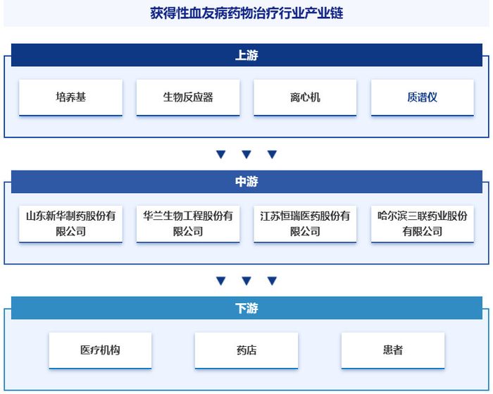 获得性血友病药物治疗行业产业链上游主要包括原材料和设备等,其中原材料主要包括血浆、化学试剂(溶剂、酸碱、催化剂等)、生物试剂(酶、抗体、培养基等)、辅料(稳定剂、赋形剂等)等,而设备则包括生物反应器、纯化设备(层析系统、除病毒过滤系统等)、检测与分析设备(离心机、高效液相色谱仪(HPLC)、质谱仪等)、冷链设备等。产业链中游为获得性血友病药物治疗的研发和生产环节。产业链下游主要包括各级医疗机构和具备资质的药店等流通渠道,以及最终的患者群体。