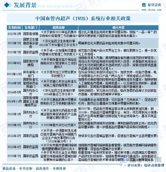 医疗器械产业是现代产业体系中具有较强成长性和带动性的战略性新兴产业,是实施“健康中国”战略的重要组成部分,因此,我国高度重视包括血管内超声(IVUS)系统在内的医疗器械产业发展,相继发布《关于做好2023年医药集中采购和价格管理工作的通知》《深化医药卫生体制改革2023年下半年重点工作任务》《关于进一步加强和完善医疗器械分类管理工作的意见》《关于做好基本医疗保险医用耗材支付管理有关工作的通知》《关于提升加工贸易发展水平的意见》《关于实施公共安全标准化筑底工程的指导意见》《深化医药卫生体制改革2024年重点工作任务》《关于完善医药集中带量采购和执行工作机制的通知》《关于全面深化药品医疗器械监管改革促进医药产业高质量发展的意见》《2025年稳外资行动方案》《关于进一步调整和优化进口医疗器械产品在中国境内企业生产有关事项的公告(2025年第30号)》《关于发布医疗器械网络销售质量管理规范的公告》《关于发布优化全生命周期监管支持高端医疗器械创新发展有关举措的公告》等一系列政策规范市场秩序,保障产品质量和患者安全,为我国血管内超声(IVUS)系统行业发展提供了良好的政策环境。