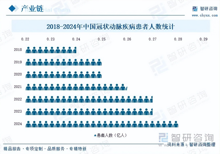 血管内超声(IVUS)系统检测直接需求人群主要为心脑血管疾病患者,心脑血管疾病已成为中国第一致死原因,被喻为“人类健康第一杀手”,而冠心病就是其中最主要的一种心脏病,也是最常见的一种心血管疾病,“冠状动脉粥样硬化性心脏病”简称“冠心病”,是由于冠状动脉血管发生动脉粥样硬化病变,引起血管腔狭窄或阻塞,造成心肌缺血、缺氧或坏死而导致的心脏病,目前检验冠心病的主要手段是冠脉造影,但该技术只能对血管内血流情况进行成像,且容易受造影角度的影响,无法对血管壁上的斑块发展情况进行判断,作为冠脉造影的重要补充手段,血管内超声(IVUS)提高了病变诊断的准确性,对冠脉介入治疗的策略、支架选择和效果评价有着重要的指导意义,近年来,受人口老龄化日益加速、肥胖、糖尿病等慢性疾病患病率上升等诸多因素影响,我国冠状动脉疾病患病率持续上升,据统计,2024年我国冠状动脉疾病患者人数达0.28亿人,同比增长3.70%,我国冠状动脉疾病患者人数持续增加带动血管内超声(IVUS)系统检测需求群体也不断扩大。