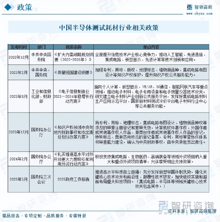 注:本文节选出自智研咨询发布的《2025年中国半导体测试耗材行业政策、产业链、市场规模及发展趋势研判:随着半导体产业工艺的持续下探,行业将朝着更精密、更复杂、更智能方向发展[图]》行业分析文章,如需获取行业文章全部内容,可进入智研咨询官网搜索查看。