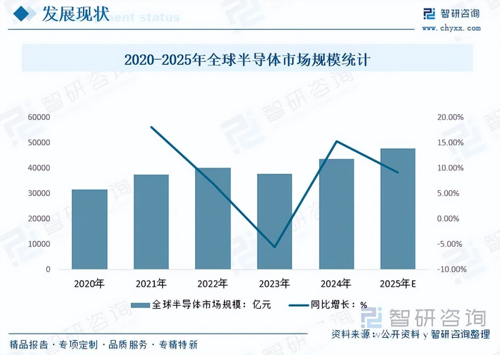 半导体行业是现代信息技术发展的重要因素,是助力国家提升“智造”水平的物质支撑。它代表了一个国家的工业技术的基础水平,在全球的信息技术产业中都处于相当重要的领域。近年来,全球各大经济体对半导体产业的重视程度日益加深,纷纷出台相关政策与战略措施等加强对半导体产业发展的支持。因此,全球半导体市场保持强劲的增长态势。2024年全球半导体市场规模从2020年的31762亿元增长到43710亿元,预计2025年将达到47731亿元。