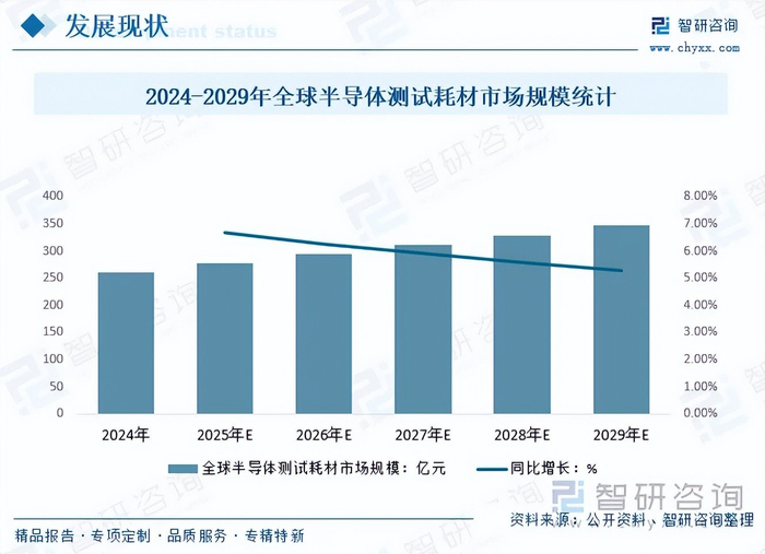 内容概要:半导体测试耗材是指在半导体制造流程的测试环节中,为完成电性能、可靠性和功能测试而使用、消耗或磨损的材料、零部件和工具。半导体行业是现代信息技术发展的重要因素,是助力国家提升“智造”水平的物质支撑。近年来,全球各大经济体对半导体产业的重视程度日益加深,纷纷出台相关政策与战略措施等加强对半导体产业发展的支持。因此,全球半导体市场保持强劲的增长态势。半导体测试作为半导体产业链中不可或缺的一环,随着工艺的持续下探,SoC的规模复杂度的持续增加,在项目中的重要性也越来越高。半导体测试耗材是半导体晶圆测试、封装测试等环节的关键配套产品,直接影响测试精度、效率与芯片良率。近年来,随着半导体产业的快速发展和测试要求的不断提高,半导体测试耗材的市场需求也在不断增长。2024年全球半导体测试耗材市场规模260亿元,预计2025年全球半导体测试耗材市场规模将达到277.4亿元左右,2029年有望达到347亿元。