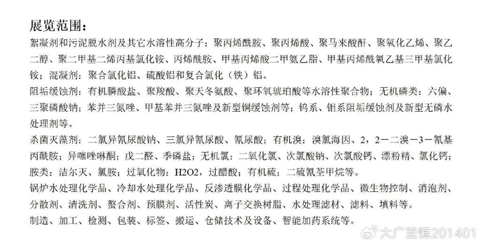 参展知名企业包括:爱森(SNF)、山东泰和、协同环保、三丰环境、百傲化学、南京顺恒信、荆洪生物、杭州电化、廊坊汇达、四新科技、龙口科达、山东普尼奥、大明消毒、波涛化工、飞宇环境、冠昌化工、凯丰化工、康华电子、清泰净化剂、裕凯化工、撒拉弗、江苏宜净、德州凯密迪、江苏聚铭、山东远联、中科天泽、爱尔福克、河南维立特、浙江新海天、海兴一诺、峰泉新材料、郑州威大、河南华明、隆科水处理、润鑫生物、巩义新奇、河南万众、利仕化学、昆山海特、河南乐邦……等。