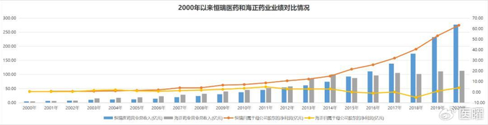 当时,海正药业常常被与恒瑞医药相提并论——两家公司同年上市,规模相当。2000年,海正药业营收5.18亿元,净利润5100万元;恒瑞医药同期收入4.85亿元,净利润6527万元。在上市之初的几年里,两家企业并肩前行,海正药业甚至略占上风。
