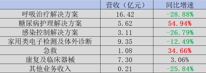 这固然与2023年上半年呼吸机和制氧机等产品需求激增带来的高基数有关,不过回头看,颓势其实早有预兆。在2019年,相关的板块业务就已经呈现下滑态势。尤其是制氧机,雾化器产品销售受到了一定影响,销售规模下降10%左右。只不过突如其来的卫生事件,不仅阻止了这样的下滑趋势,还带动了一波高的增长。