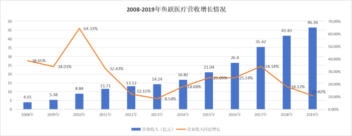 图:鱼跃医疗2008—2019年营收及增速,来源:锦缎研究院不过在公司营收持续增长背后,则是营收增速的连续下降。至2019年公司的营收增速已经下降至10.82%,这一业绩增速仅比2013年略高。