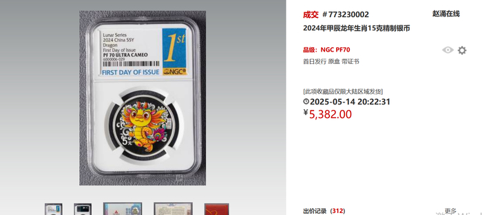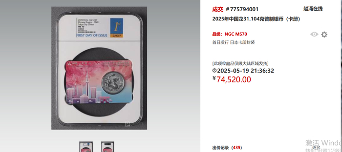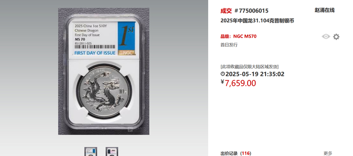 截至5月19日,首日发行日本卡册封装版的中国龙银币,在国内知名金银币交易平台,成交价已经达到7.45万以上。即便是不带卡册的评级币,首日发行的也达到了7千以上。出价记录不断破百,更体现近期其热度惊人。
