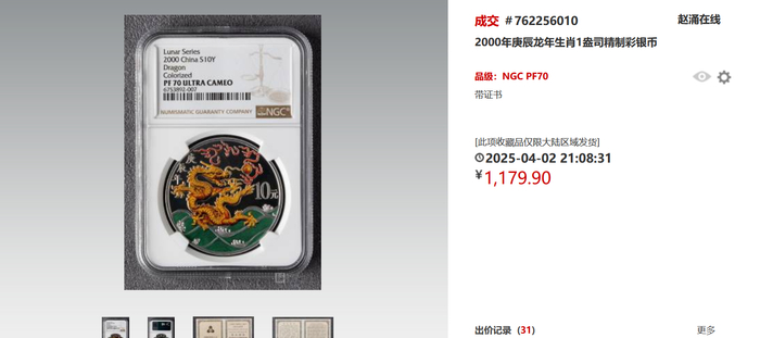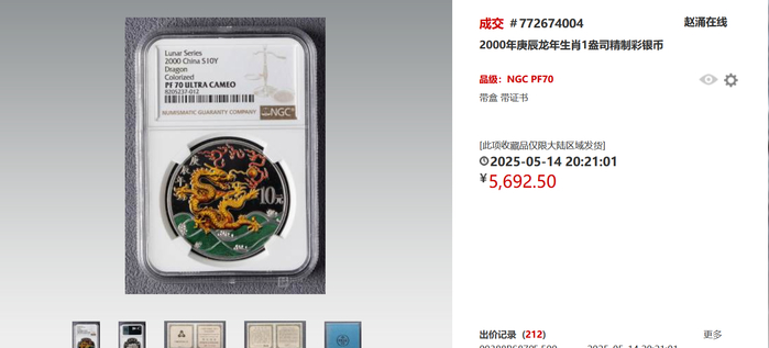 另一个瞩目的品种则是2000年庚辰龙年生肖1盎司精制银币,一个月前的成交价在1100元以上,而近期的成交价翻了四倍,达到5692元。更足以说明龙的热度,可谓“龙气”逼人。