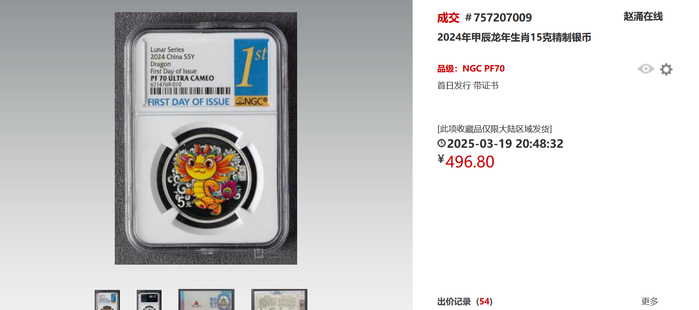 先拿赵涌在线这两天成交的2024年甲辰龙年生肖15克精制银币举例:这个品种在3月19日,即两个月前,成交价为496元。