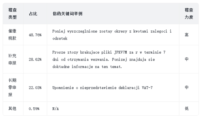 从数据中可以看出,催缴税款类稽查信函占比最高,接近一半,显示出税局对补缴税款的重视。值得注意的是,**“长期零申报”**类稽查信函占比达到 22.03%,这是本月首次出现较大规模的针对此类情况的稽查。这表明波兰税局开始系统性地排查那些长期没有实际交易但仍然保留 VAT 税号的企业,这可能与《波兰增值税法》第 96 条有关,该条规定连续六个月零申报将自动触发税局对企业合规性的风险评估。