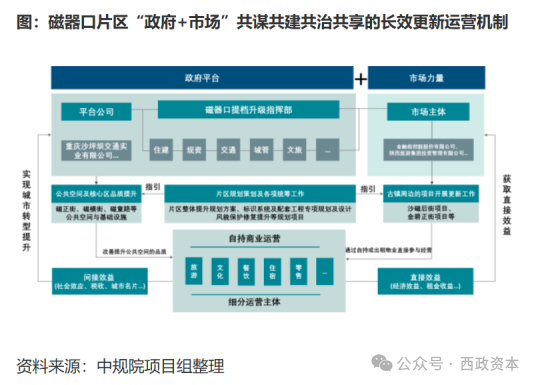 1. 政府层面,建立磁器口提档升级指挥部,搭建各项工程的统筹平台,负责主要公共空间及古镇核心区域的品质提升,比如由重庆沙坪坝交通实业有限公司(沙坪坝区交通局下属平台公司)负责磁正街、磁横街、磁童路等公共类相关项目的更新工作。