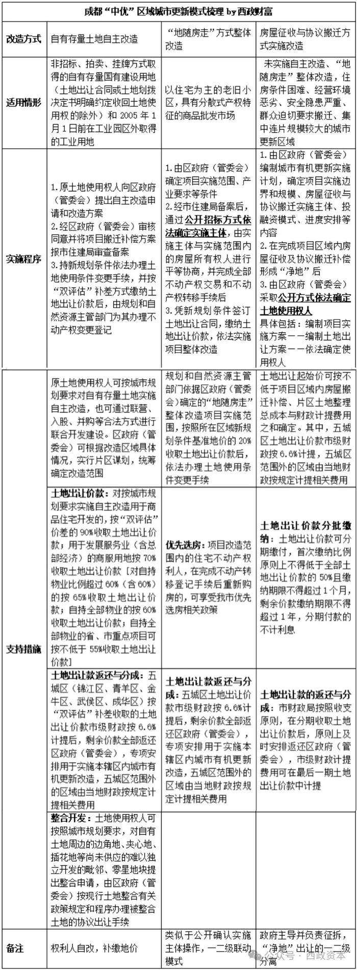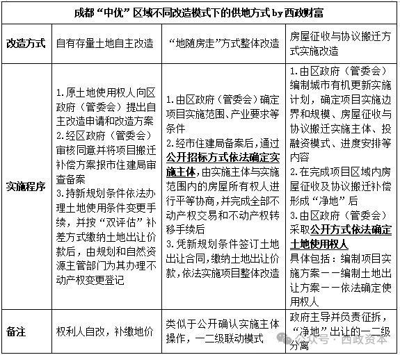 《成都市人民政府办公厅关于进一步推进“中优”区域城市有机更新用地支持措施的通知》(成办发〔2021〕33号)明确“发挥市场主体作用,鼓励支持原土地使用权人及各类市场主体积极参与城市有机更新,推动对自有存量土地进行自主改造或联合开发,实现多方利益共赢”......“结合城市有机更新工作实际,探索城市更新改造项目市场化运作模式,创新土地供应方式,加快盘活城镇存量、低效国有建设用地,提高城市更新改造效率”。成办发〔2021〕33号对于“中优”区域(中部区域是都市功能优化区)的改造方式也做了明确,即“自有存量土地自主改造”、“地随房走”方式整体改造、房屋征收与协议搬迁方式实施改造。