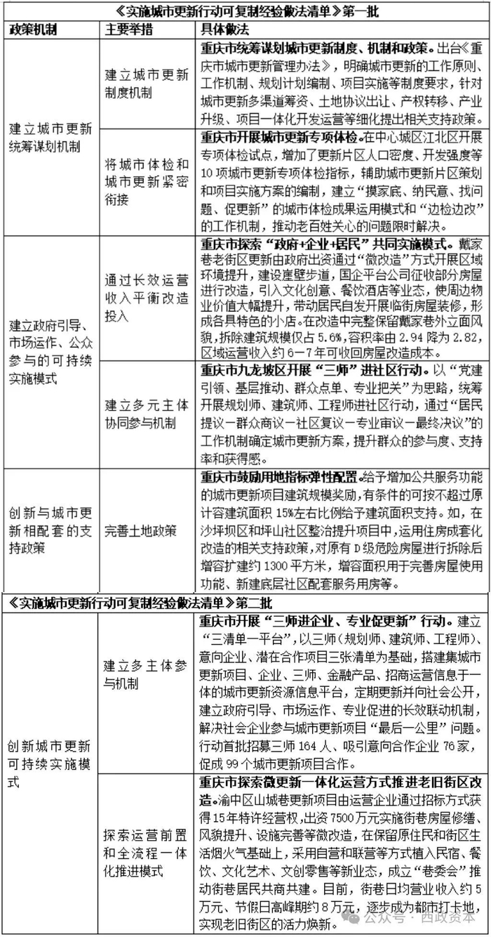 在住房和建设部办公厅公布的第一批和第二批《实施城市更新行动可复制经验做法清单》中,对重庆的城市更新的一些经验也进行了说明。