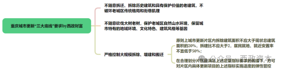 《重庆市人民政府关于印发重庆市城市更新管理办法的通知》(渝府发〔2021〕15号)明确,城市更新应当遵循“政府引导、市场运作,改革创新、统筹推进,以人为本、共建共享”的原则。《重庆市城市更新技术导则》以及《重庆市住房和城乡建设委员会关于加强城市更新项目管理的通知》(渝建人居〔2022〕19号)明确了重庆城市更新的“三大底线要求”: