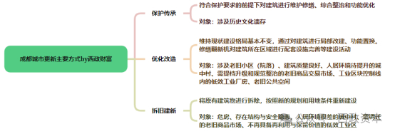 成都城市更新的主要对象包括老旧小区(院落)、城中村、历史文化遗存、低效工业区、老旧商品交易市场、老旧公共空间类。成都城市更新按照“少拆多改、注重传承”的原则,采取留改建相结合,以保护传承、优化改造为主,拆旧建新为辅。