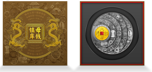 (二)《镇库母钱》纪念典藏双连号套组,含纯银1000克,直径150mm,成色均为99.9%,铸造发行量999枚,统一发行价33600元。