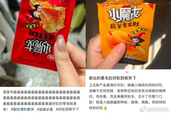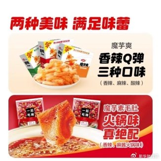 魔芋制品是一种以魔芋为主要原料的食品,近年来,因其低热量、高纤维的特点,逐渐成为休闲食品市场中的热门产品。而作为辣味休闲食品领域的领头羊,卫龙早在2014年就已前瞻性地推出了魔芋爽,十余年来深受消费者喜爱,被称为“人类猫条魔芋爽”,成为卫龙第二个年销售额超10亿元的大单品,推动了魔芋制品市场的发展。近两年,卫龙又从经典的魔芋爽出发创新,推出了小魔女系列魔芋素毛肚、魔芋素板筋新品,不断为消费者带来惊喜,满足多样化的口味需求。