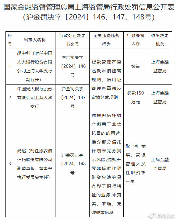近日,一则关于中国光大银行股份有限公司(以下简称“光大银行的”,601818.SH)的处罚信息引起了业界的关注。概言之,该行的上海大华支行因“贷款管理严重违反审慎经营规则、信用证管理严重违反审慎经营规则”,时任支行副行长胡中利被给予警告处罚、该支行则被罚款150万元。