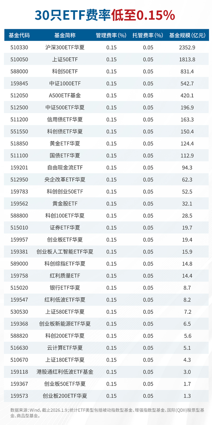 截至1月9日,在华夏基金旗下117只ETF中,有83只产品在跟踪同指数的ETF产品中处于费率最低档位(含24只指数唯一跟踪ETF产品);