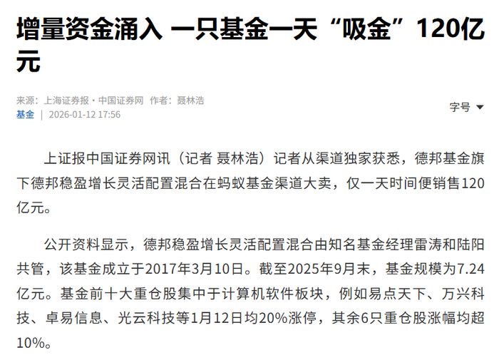 几乎在西贝陷入流量窘境的同时,金融圈正上演一场同样引人注目的流量大戏。2026年1月12日,上证报一则“德邦稳盈增长一只基金一天吸金120亿”的消息,迅速点燃了市场情绪。