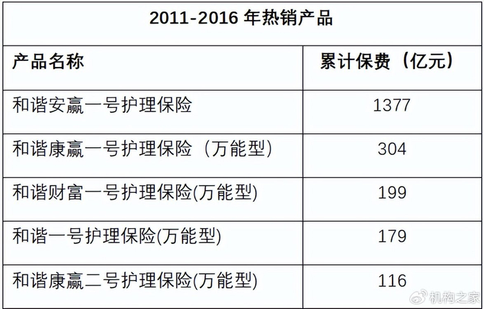 其核心驱动力是一种名为“护理保险”的理财型产品。这类产品虽然冠以保障之名,但其内核是通过附加万能账户,提供具有强烈储蓄和理财色彩的高现金价值。在2015年至2016年的市场高点,和谐健康凭借此类产品实现了规模的惊天跨越。公开数据显示,其原保险保费收入从2015年的308亿元,一跃至2016年的1070亿元。其中,仅一款名为“和谐安赢一号护理保险”的产品,在2016年就录得超过千亿元的保费。