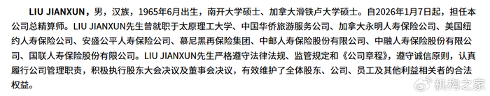履历显示,新任总精算师刘建勋,1965 年 6 月出生,持有南开大学与加拿大滑铁卢大学双硕士学位,拥有北美精算师资格。其职业生涯早年曾任职太原理工大学,中国华侨旅游服务公司,踏入保险业后,曾先后任职于加拿大永明人寿、美国纽约人寿、安盛公平人寿、慕尼黑再保险集团等国际保险机构;回归国内市场后,又相继出任中邮人寿、中融人寿总精算师,以及国联人寿总精算师、财务负责人。