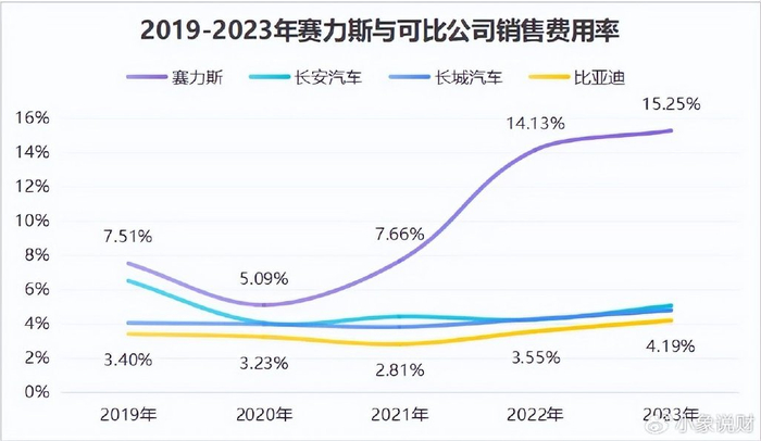 2023年,赛力斯销售费用率高达15.25%,远高出比亚迪(4.19%)、长城汽车(4.78%)、长安汽车(5.05%)。
