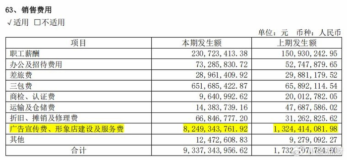 2024中报显示,公司销售费用下属会计科目中,“广告宣传费、形象店建设及服务费”的金额最高为82.49亿元,同比大增523%,比去年全年的销售费用还高。