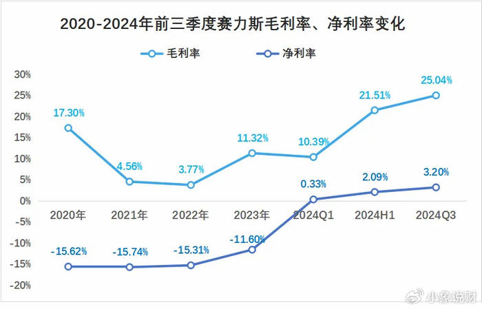 不仅如此,在2024年前三季度,赛力斯以25.23%的毛利率,成为国内盈利能力最强的汽车公司。而且力压特斯拉(19.84%),即使扩大到全球范围来看,也是十分强势的存在。