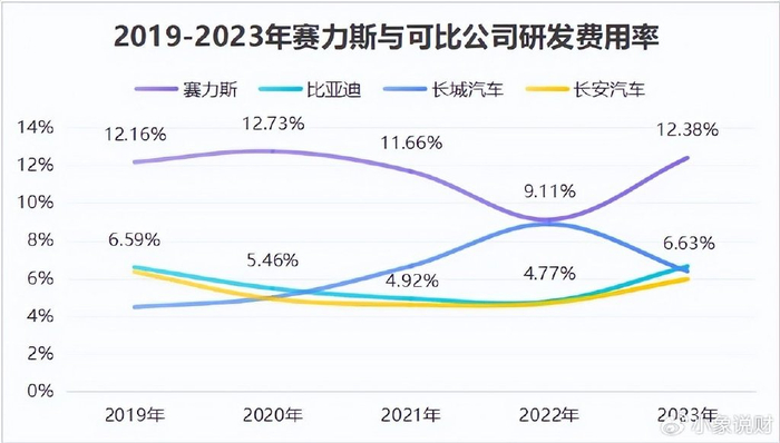 2019-2023年,赛力斯研发费用率常年在10%以上,仅2022年为9.11%,但仍高于比亚迪、长城汽车等公司。要知道,即使是行业龙头比亚迪,研发费用率一般也不超过7%。