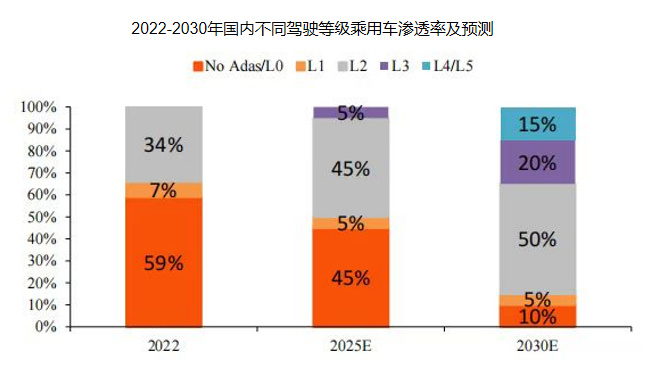 目前,国内智驾技术正处于从L2向L3及以上级别加速过渡的过程中,预计2030年国内L3及以上级别乘用车渗透率将达到35%,进展迅猛。