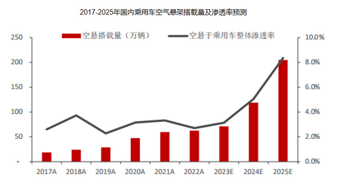 所以,随着智能驾驶逐步渗透,线控底盘和空气悬架使用量都有望增加。预计2025年,国内乘用车空气悬架渗透率将达到8.4%,市场规模将迅猛增长到140亿元。