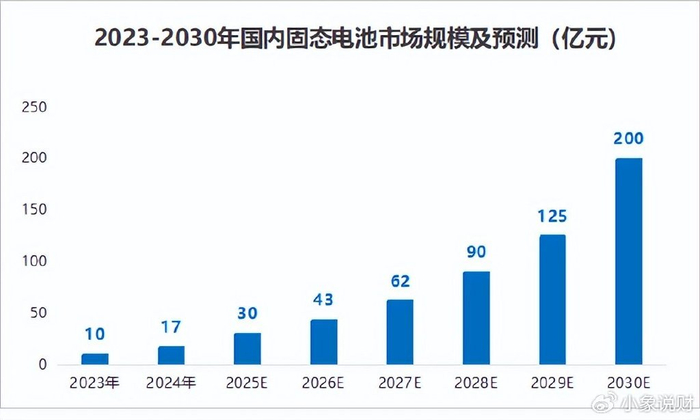 预计2023到2030年,国内固态电池市场规模将从10亿元迅猛增长至200亿元,年复合增长率高达53%。
