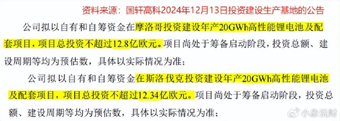 2024年12月13日,国轩高科发布公告称,公司将在摩洛哥、斯洛伐克分别建设年产20GWh的高性能锂电池及配套项目,预计总投资额折合人民币约190亿元。
